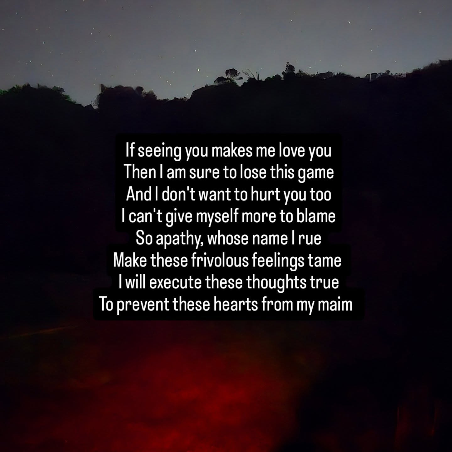 This poem indulges in a lot of self-denial, though. I've set my feelings against each other; I'm not sure what to do except to isolate myself from the people I enjoy being around the most. I can't bring myself to get fixated on people like I have been doing. So I would rather... not love, not care, not feel. It feels wrong...